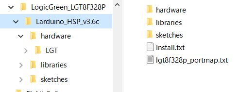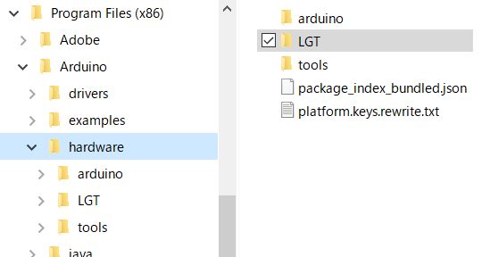 「hardware」フォルダ内の「LGT」フォルダを、Arduinoの「hardware」フォルダにコピー