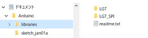 そこで、「マイドキュメント - Arduino - librarys」に「LGT」フォルダを作成して 解凍したLGTの「Library」フォルダをコピー