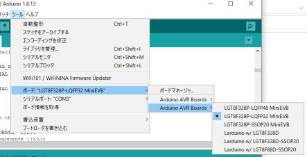 ここで、「LGT8F328P-LQFP32 MiniEVB」を選択