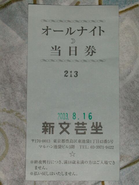 池袋までは、 北千住 −(常磐線)→ 日暮里 −(山手線)→ 池袋 と乗り継いだのですが、常磐線が雨のため15分程度遅れた他は何事も無く池袋に到着。21:30すぎには新文芸坐に入ることが出来ました。