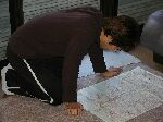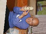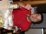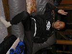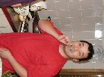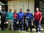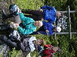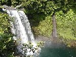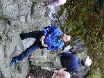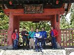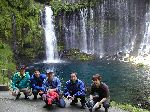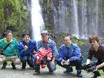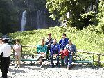 白糸の滝の前で記念撮影 滝から流れ出る河には、錦鯉のようなマスが泳いでいる