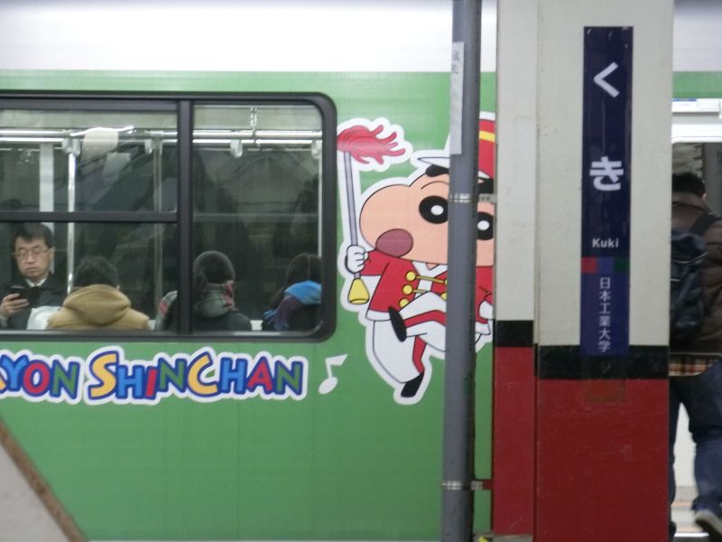 浅草方面行きのホームには、「クレヨンしんちゃん」のラッピング電車が止まっていました。